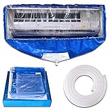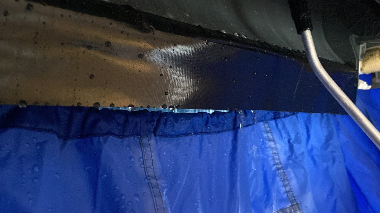 理由は、この状態を作らないと一部の水滴がエアコン本体の下部(写真の青いカバーの根本)につたってしまうからです。