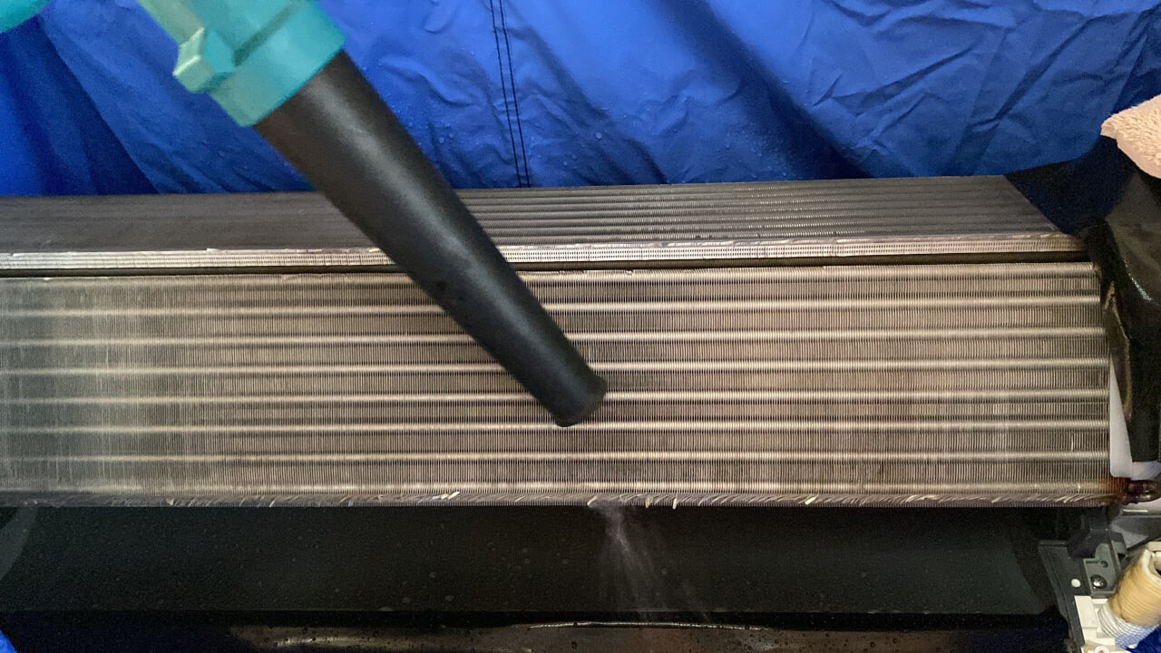 熱交換器を洗浄後、ブロアーで水滴を驚くほど早く取り除くことが出来ます。