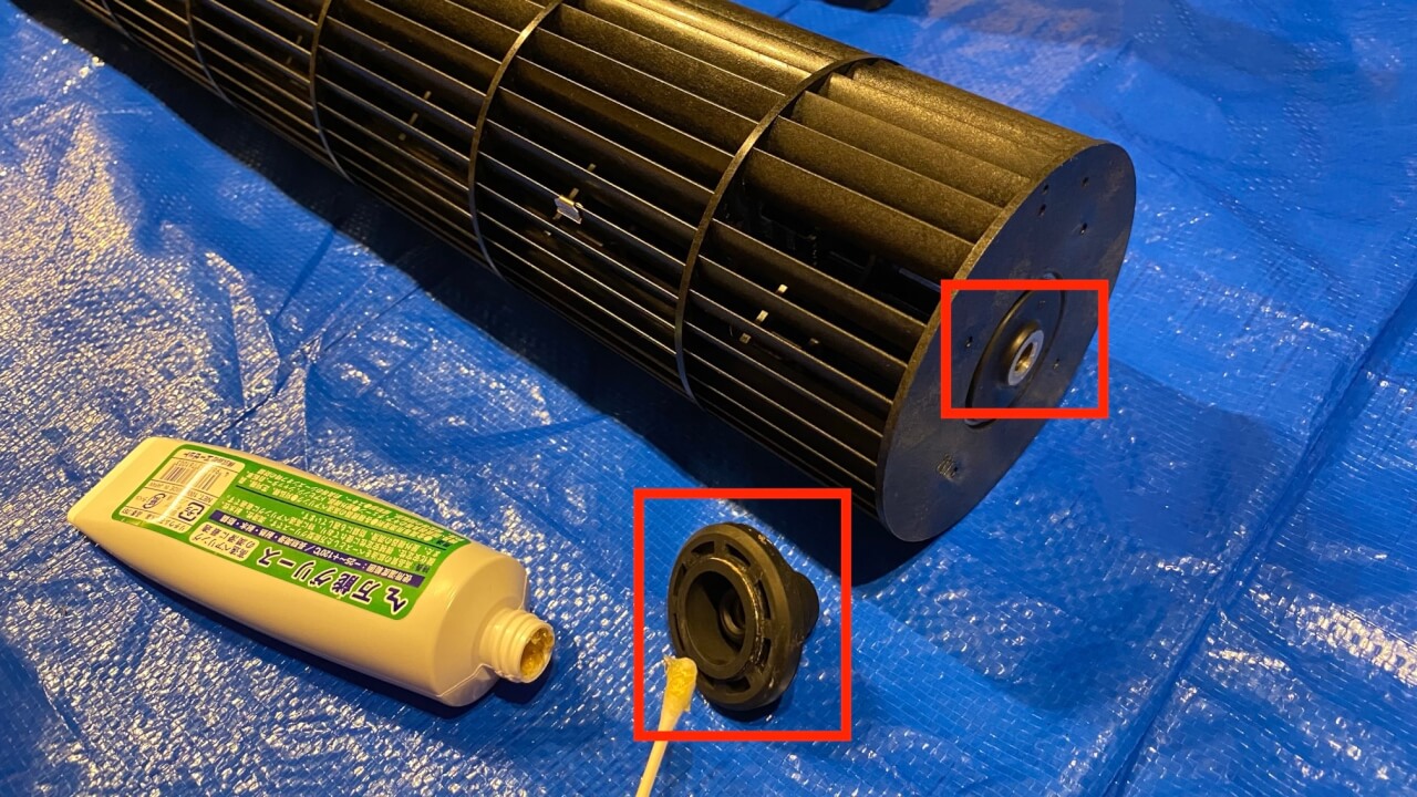 まずはシロッコファンの回転で摩擦が生じる部分にグリスを塗ります。