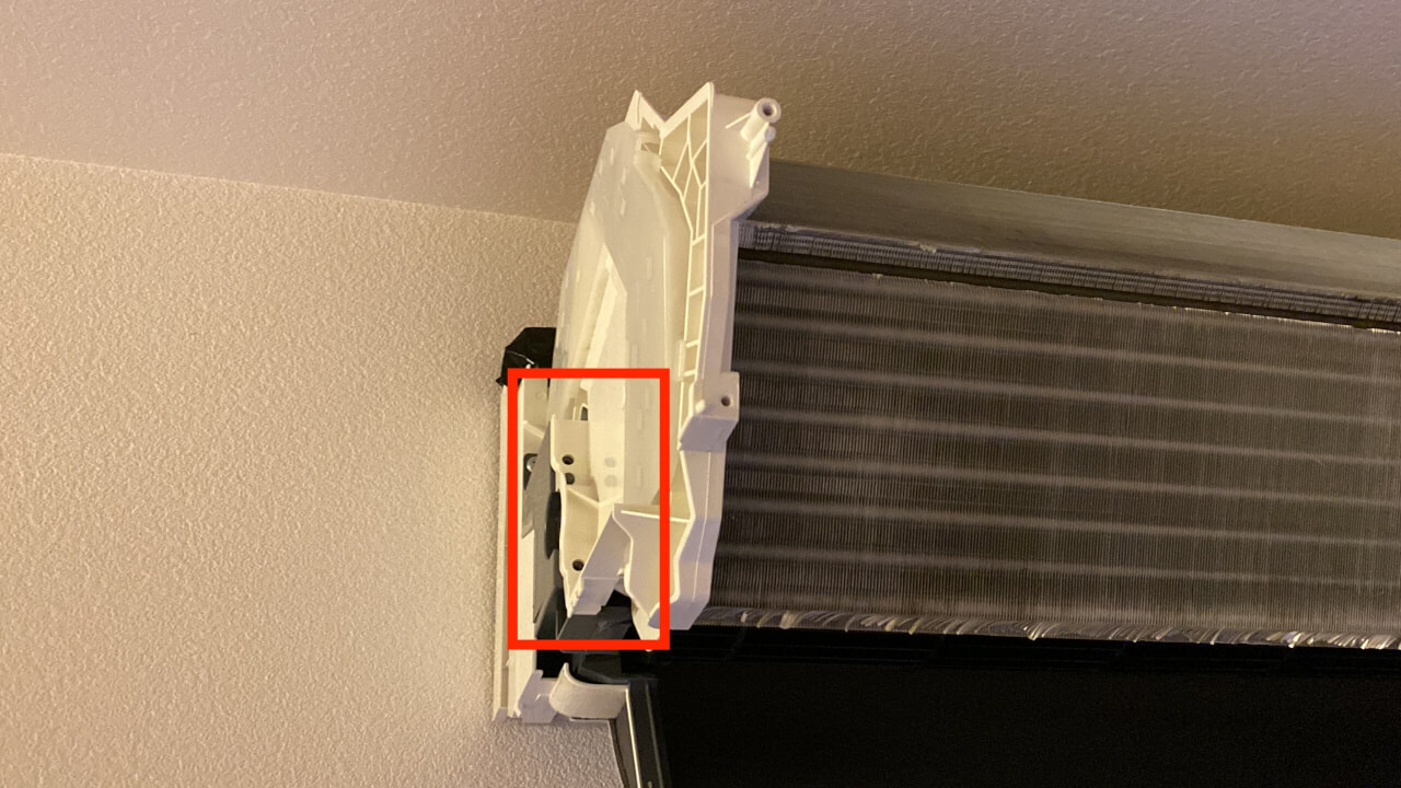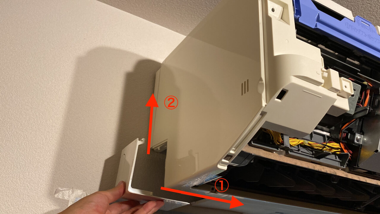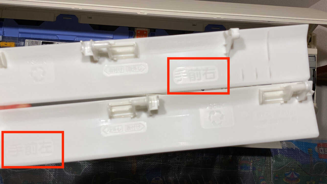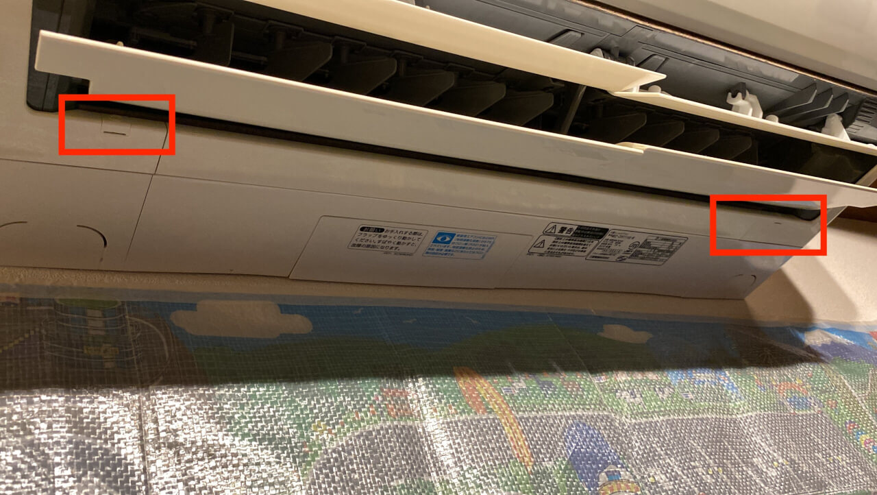 前面カバーは両端のアームをエアコン本体の受け部分(凹部分)に押し込むと入ります。