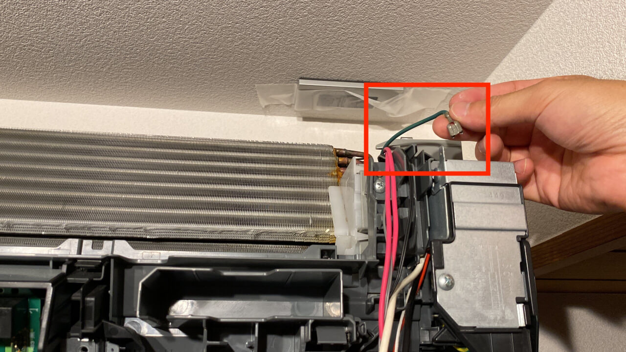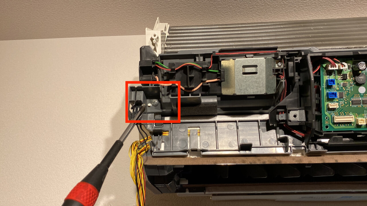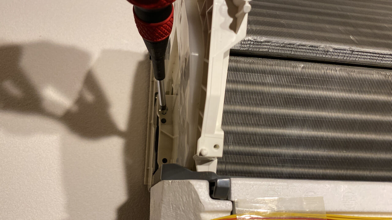 ドレンパンまで戻せたら、熱交換器を固定している左側のビス2本を元に戻します。