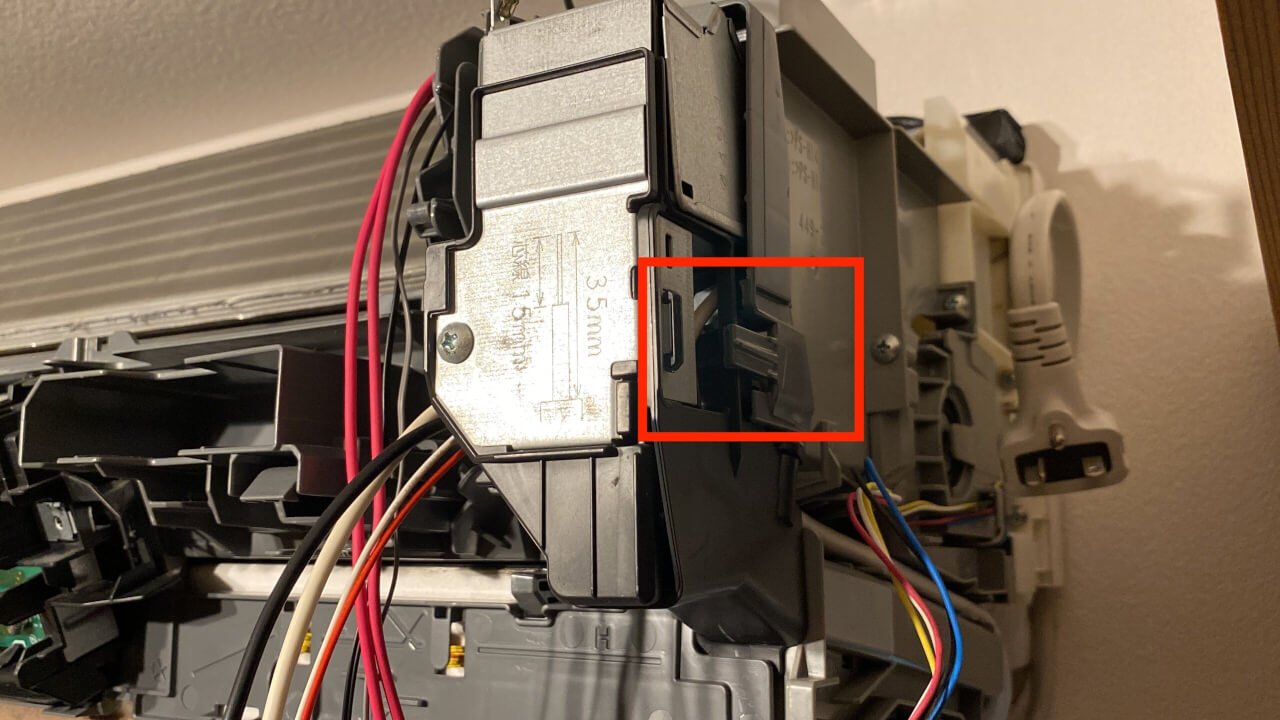 ドレンパンを戻したら、上記写真の印をつけた部分がきちんとハマっていることを確認しましょう。
