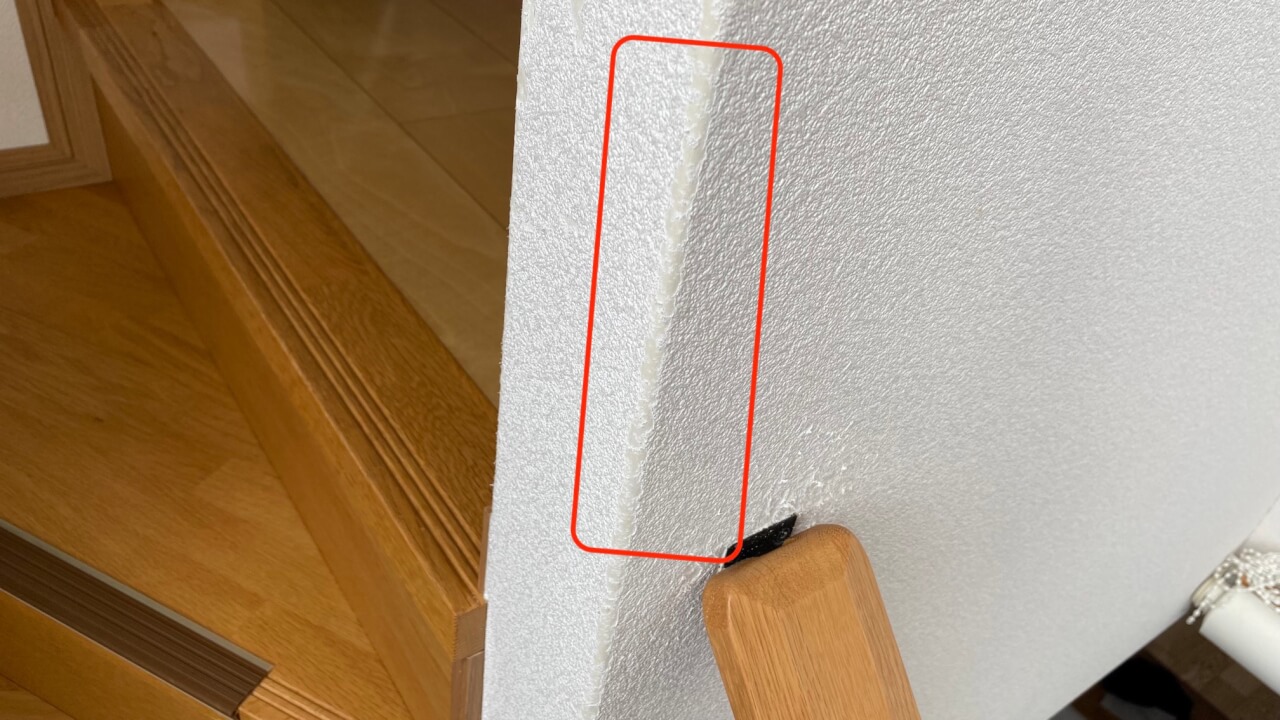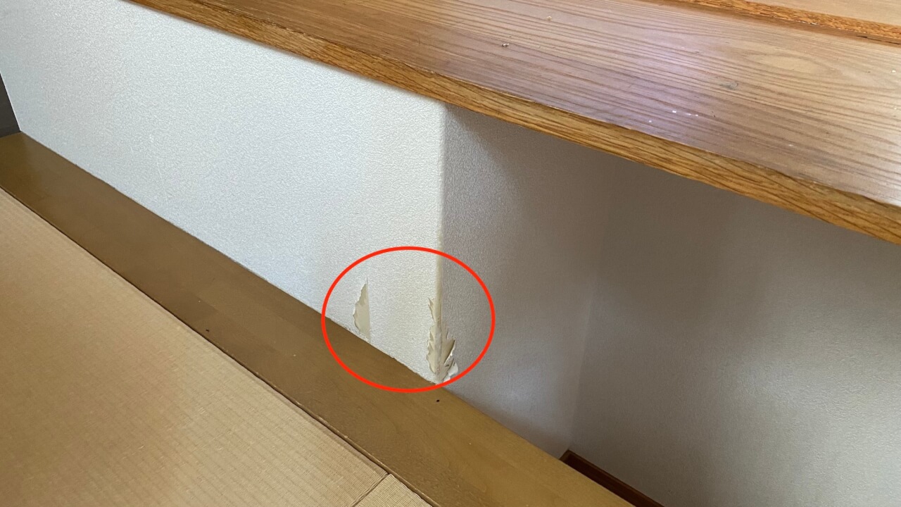 →これは、子供が遊ぶ中で壁に足をかけたりする中でめくれ上がった壁紙を、また別の時につまんでしまって剥がれました。