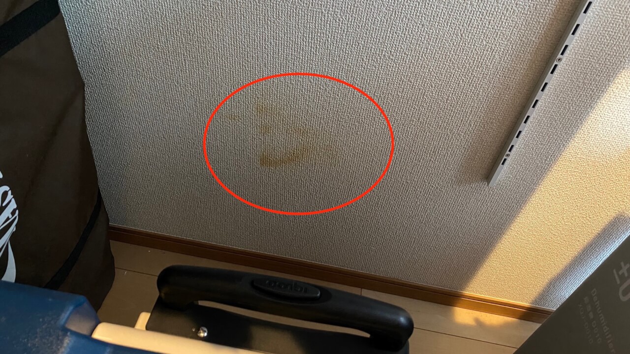 →これは、納戸でレジャー用品を壁紙に接して保管していたため、気がついたら壁紙が変色していました。