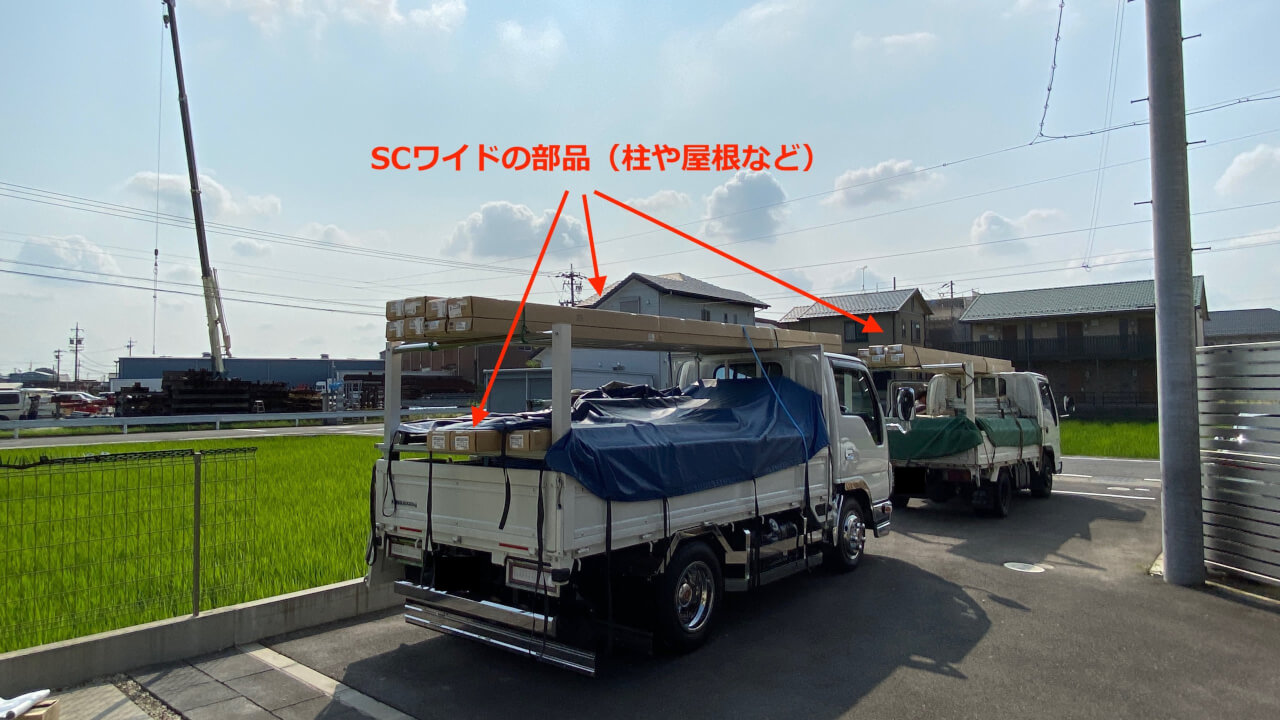 なぜなら、カーポートSCワイドの場合は材料が多く、トラック2台でくる可能性があるからです。
