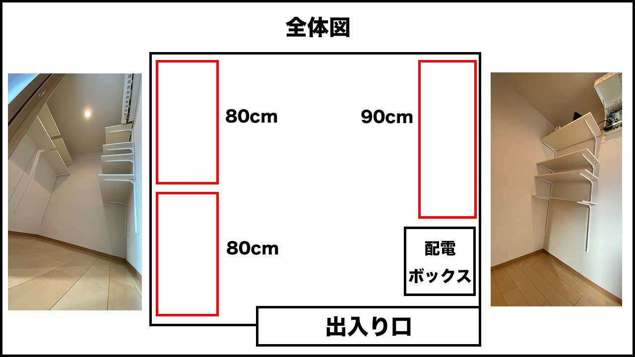 今回、納戸の左面に2列分の棚を、もう右面は配電盤ボックスを避けるように1列の棚を設置しました。