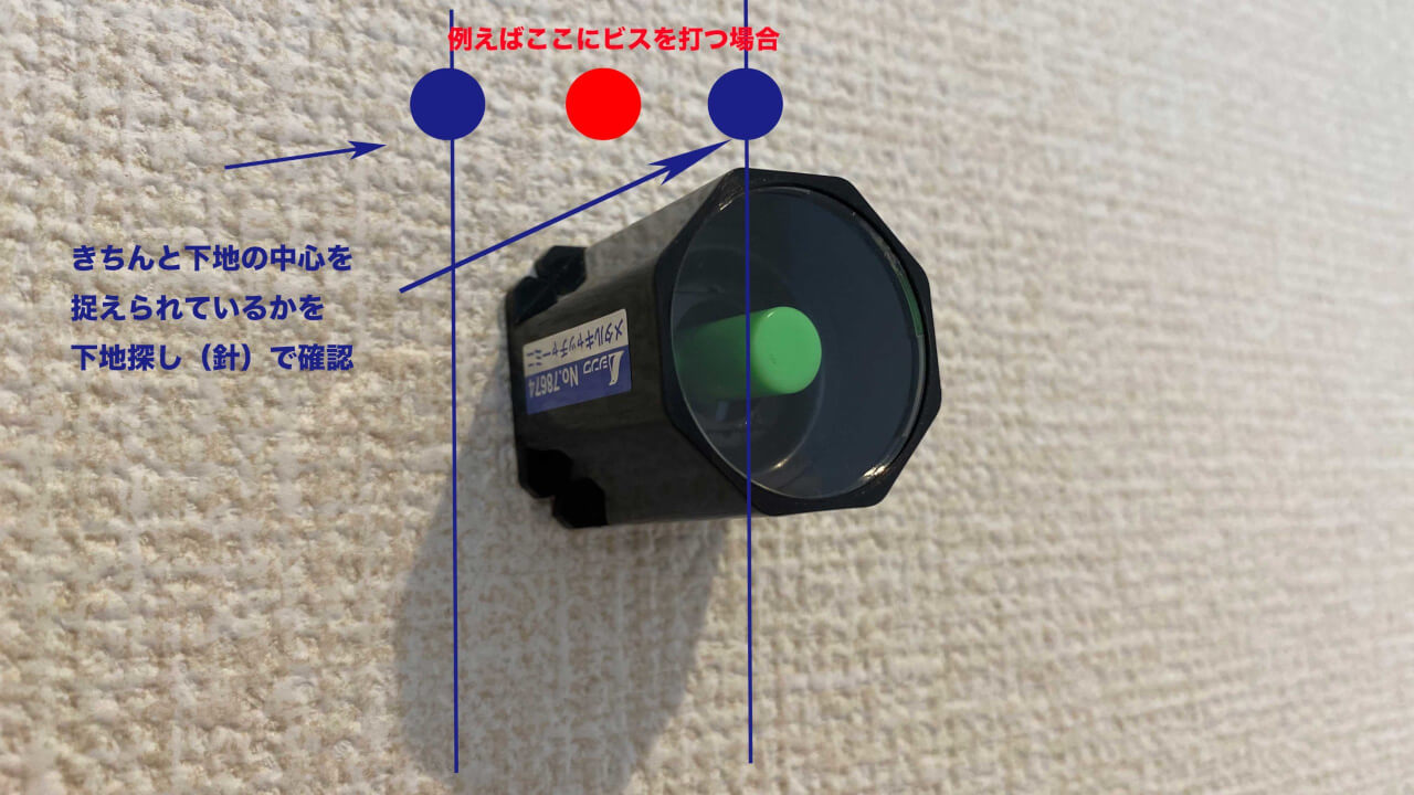 自分がこれからネジを差し込もうとしている位置の両サイドを下地探し(針)で刺してみて、100%下地があることを確認します。