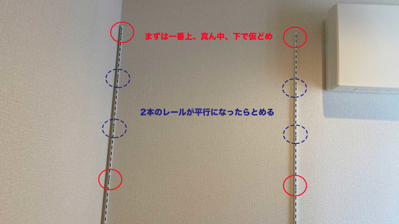 例えば「下から35cmの位置からレールを開始する」など決めておくと良いでしょう。