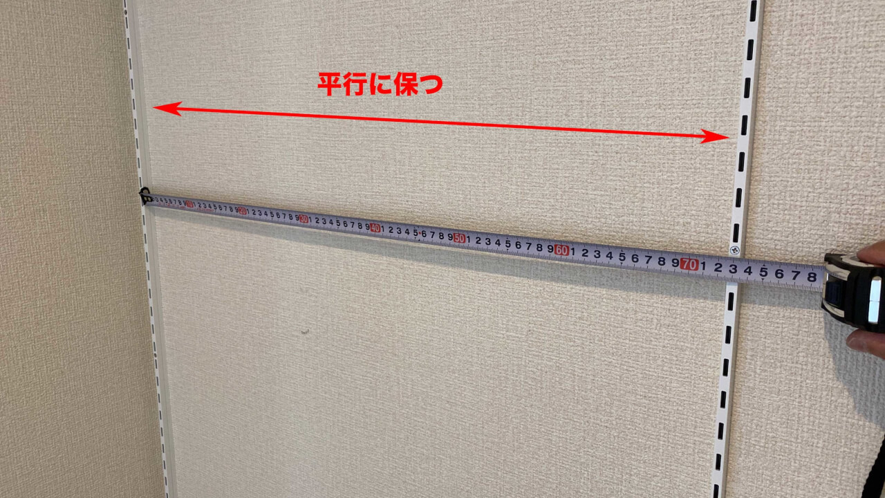 出来る限り平行に設置する際のポイントですが、突っ張り棒を活用するとおおよそ平行にすることが出来ます。
