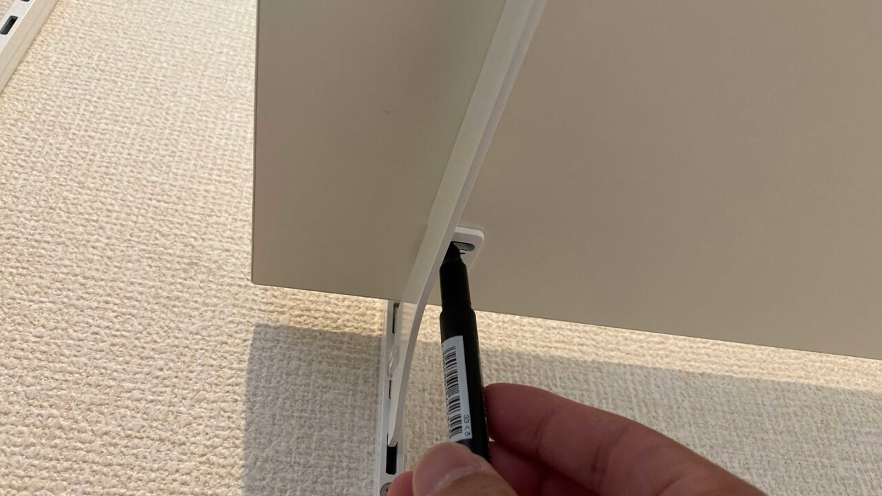 棚板の位置が決まったら、木棚用ブラケットの裏の楕円形部分にマジックで色をつけましょう。
