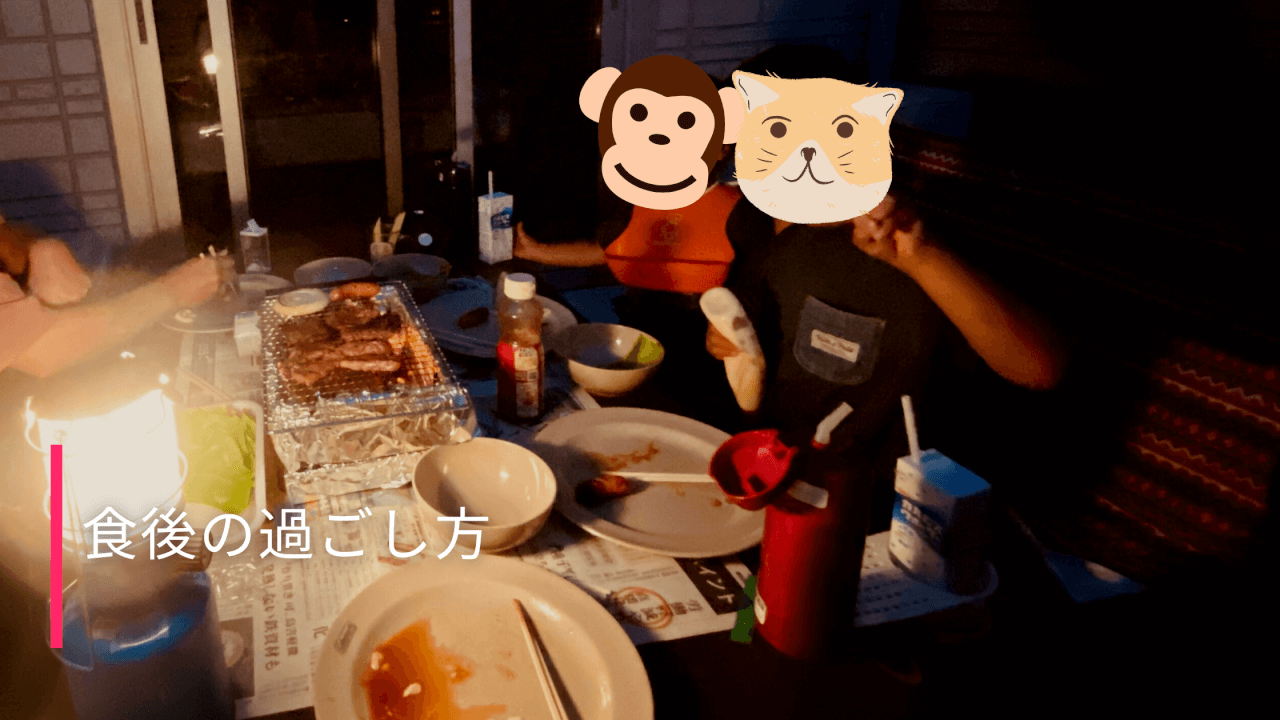 1時間ぐらいで食材+マシュマロも食べ終わるようなイメージなので、団らんの時間は19:00-19:30の30分ぐらいだよ。